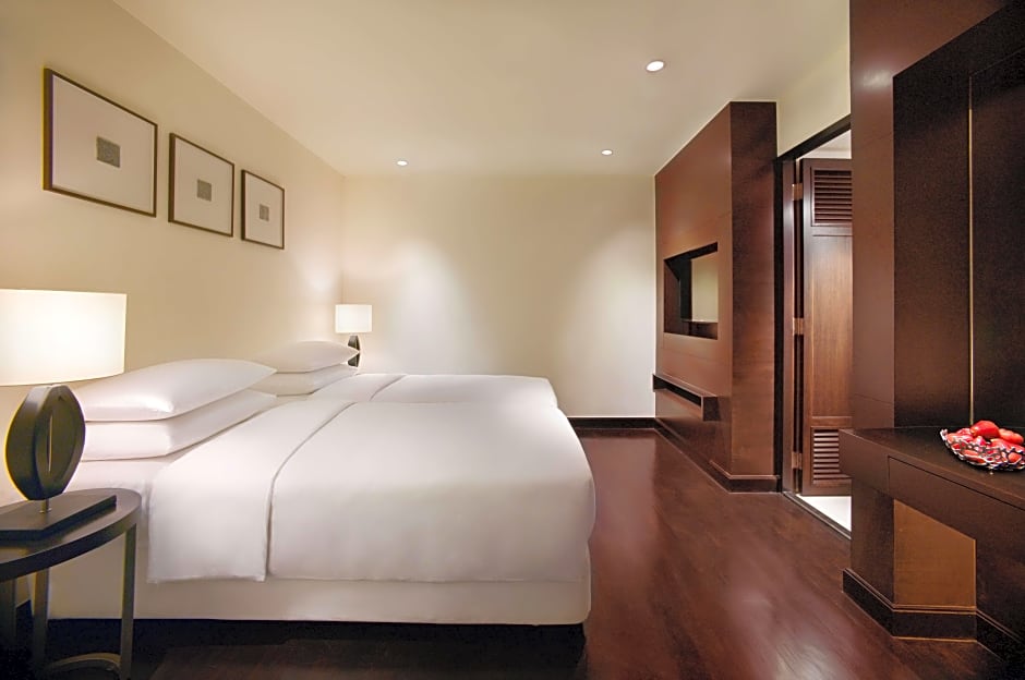 Spread out in a spacious 67-square-yard space, this room features one king-size bed with an additional room with a twin bed, perfect for a family. The two rooms share a bathroom with a separate bathtub and walk-in shower, chaise, and work desk with views of tropical gardens.